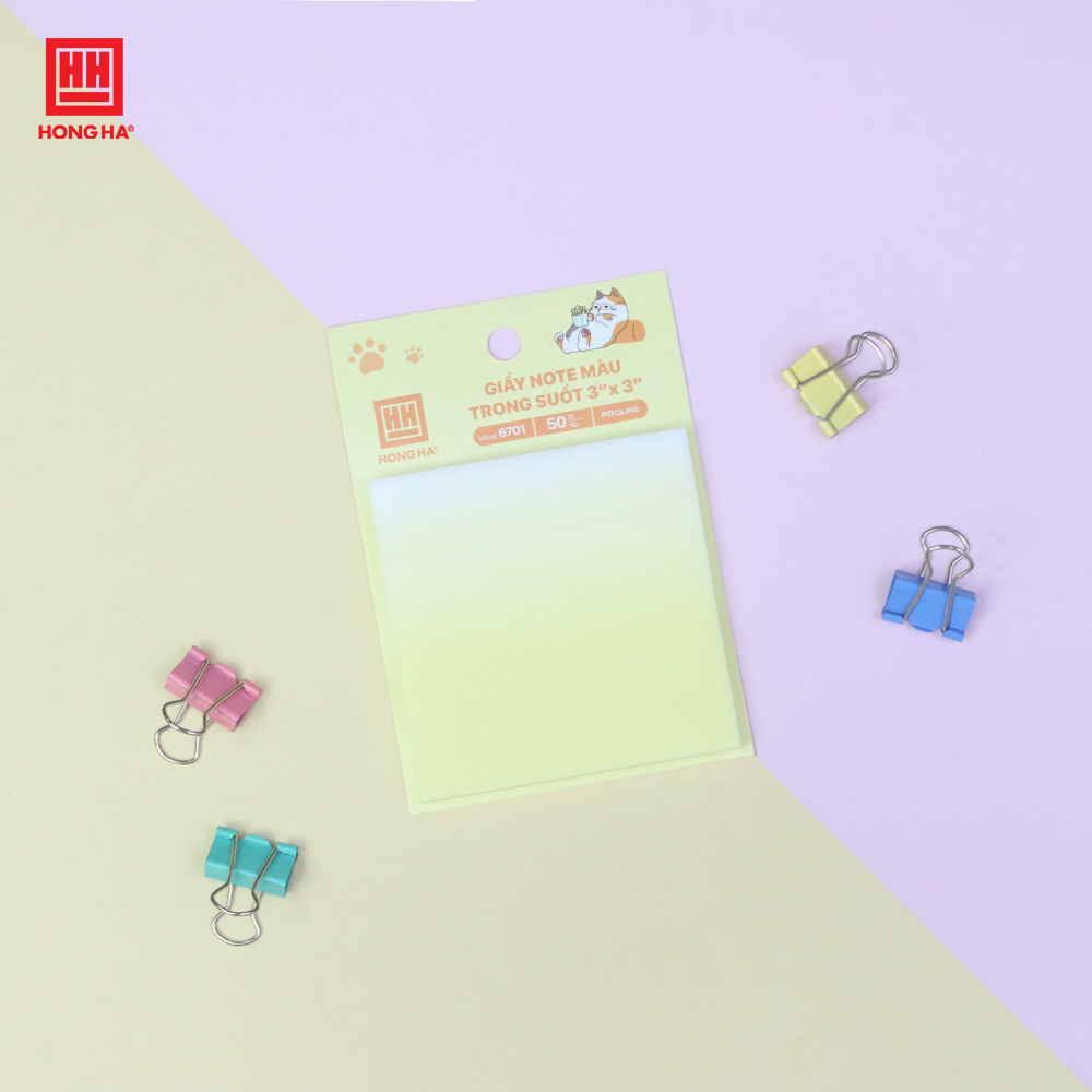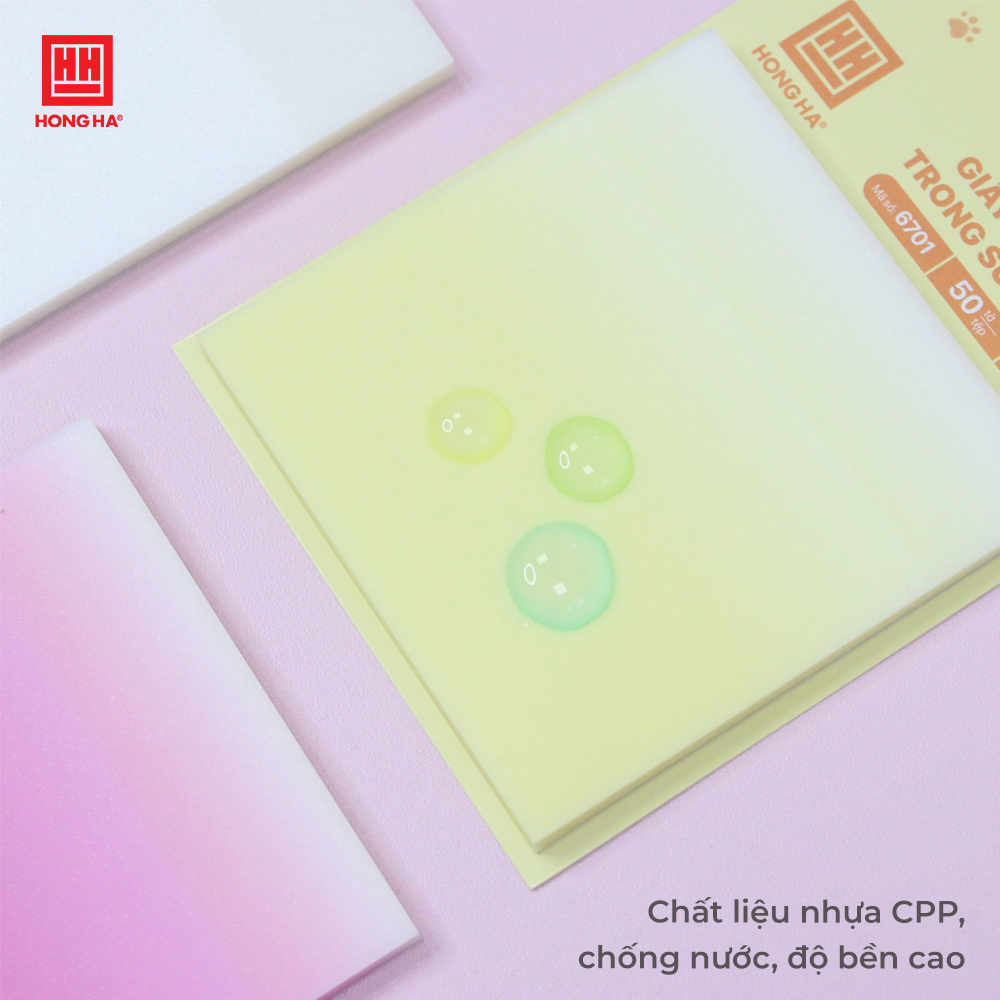 Giấy note màu trong suốt Hồng Hà - 6701 được làm từ chất liệu nhựa PCC trong, bền đẹp và chống nước nhẹ, giúp ghi chú rõ ràng mà không che mất nội dung bên dưới. Sản phẩm gồm nhiều màu sắc tươi sáng, hỗ trợ phân loại thông tin hiệu quả, phù hợp cho học tập và công việc. Keo dán chắc chắn, dễ tháo gỡ mà không làm hỏng bề mặt giấy.