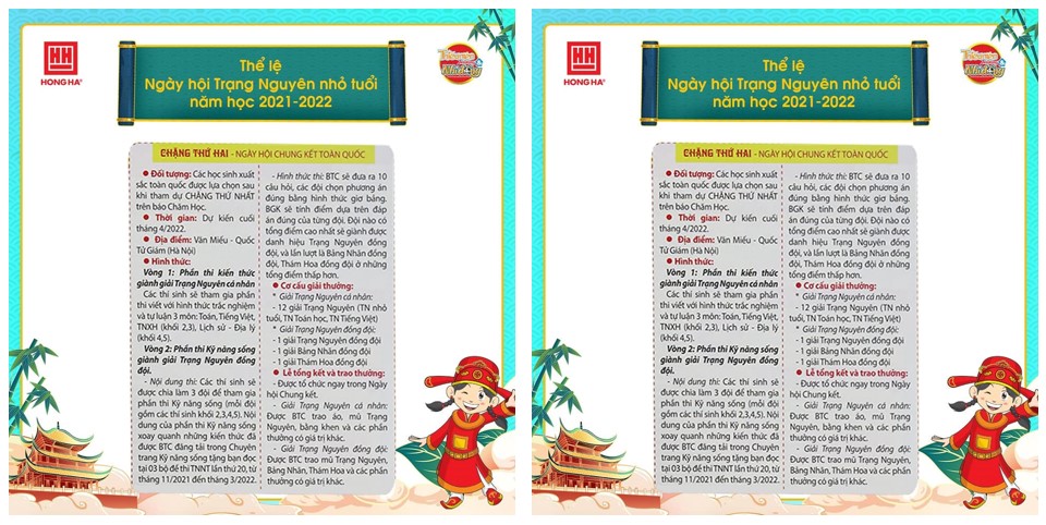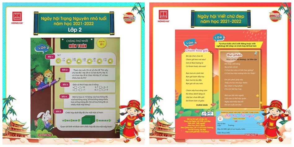 Quý vị phụ huynh và các bạn học sinh có thể cập nhật, tham khảo thể lệ Ngày hội và bộ đề thi Trạng nguyên nhỏ tuổi, Bảng vàng ghi danh và Viết chữ đẹp Nét chữ - Nết người trên fanpage Văn phòng phẩm Hồng Hà.
